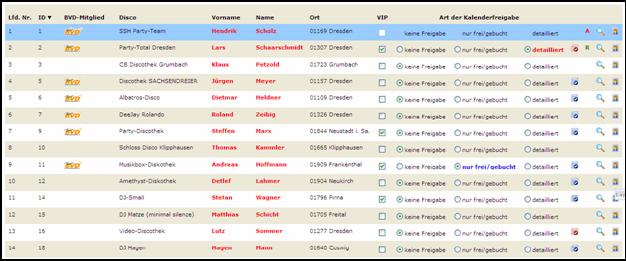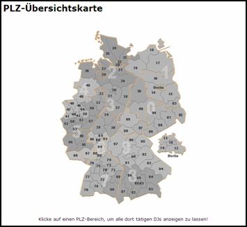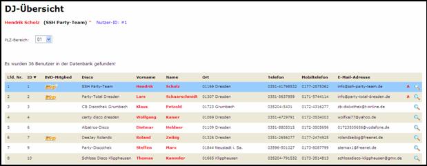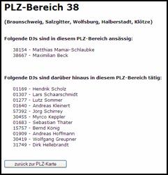 Nach der Auswahl eines Bundeslandes erhält man zunächst alle dort registrierten DJs in einer Kurzübersicht mit folgenden Daten: