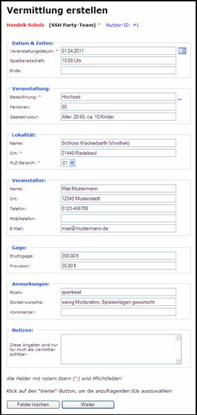 Im Sinne einer erfolgreichen Vermittlung empfehlen wir, das Formular komplett (soweit die Daten verfügbar sind) auszufüllen, damit der ausführende DJ nach seiner Zuweisung Zugriff auf alle Daten hat.