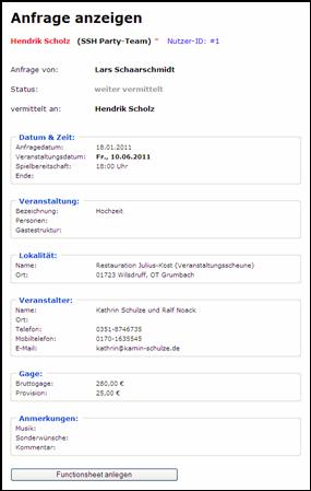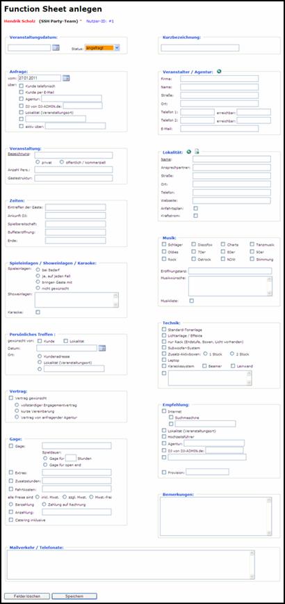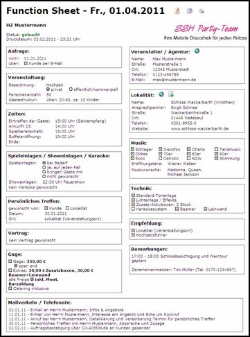 ausgewählte DJs - Veranstaltungsdatenblatt („Function Sheet“) mit allen relevanten Informationen zu jeder Veranstaltung