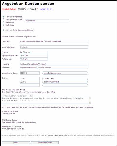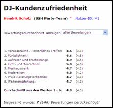 - Ermittlung der Kundenzufriedenheit bei weiter vermittelten Veranstaltungen, indem der Veranstalter per E-Mail-Link die Möglichkeit hat, seinen DJ zu bewerten