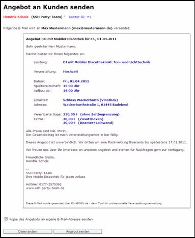 Die E-Mail an die DJs enthält bewusst nur das Veranstaltungsdatum, die Bezeichnung der Veranstaltung, den Veranstaltungsort und die vereinbarte Gage sowie die Provision. Die Kontaktdaten des Veranstalters sind für den ausführenden DJ erst dann einsehbar, wenn die Veranstaltung einem DJ zugewiesen wurde.
